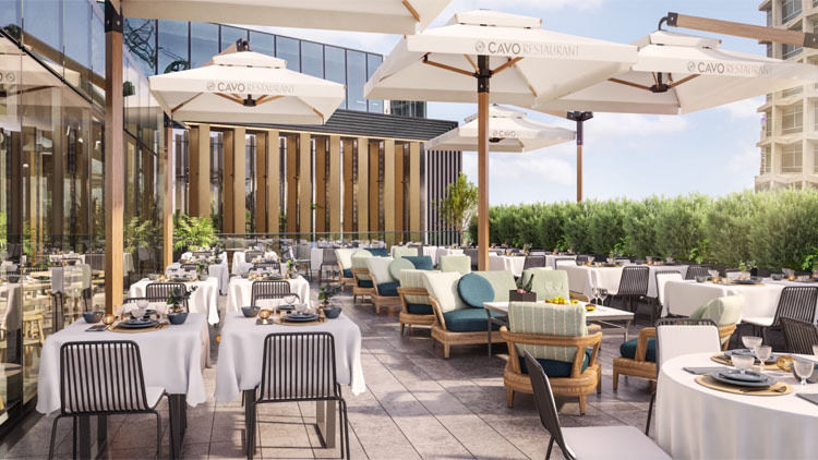 Cavo Restaurant's modern design combines warmth and sophistication. Ligh wood furniture, lush greenery, and sleek lighting create a welcoming yet contemporary atmosphere.